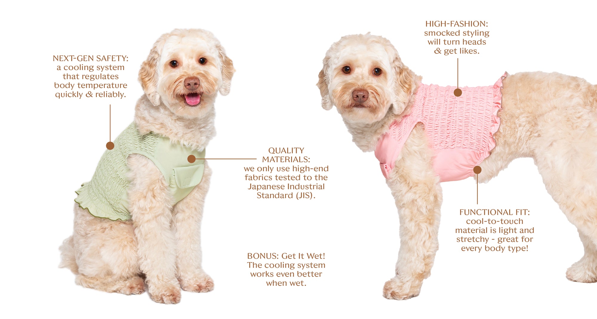 Our lightweight tops and bandanas are made from lush, cool-to-touch material - and feature our signature Ice Pack Cooling System, which safely and efficiently cools at the core of your dog’s body.